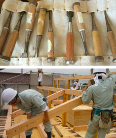 片桐工務店では、本当に"木"の特性や組み方、経験から学ぶ様々な技術を持った郡上の名大工が揃っています。かなづちの持ち方、のこぎりの切り方、カンナの掛け方、道具の手入れまで基本から徹底的に仕込まれた大工職人達が施工いたします。