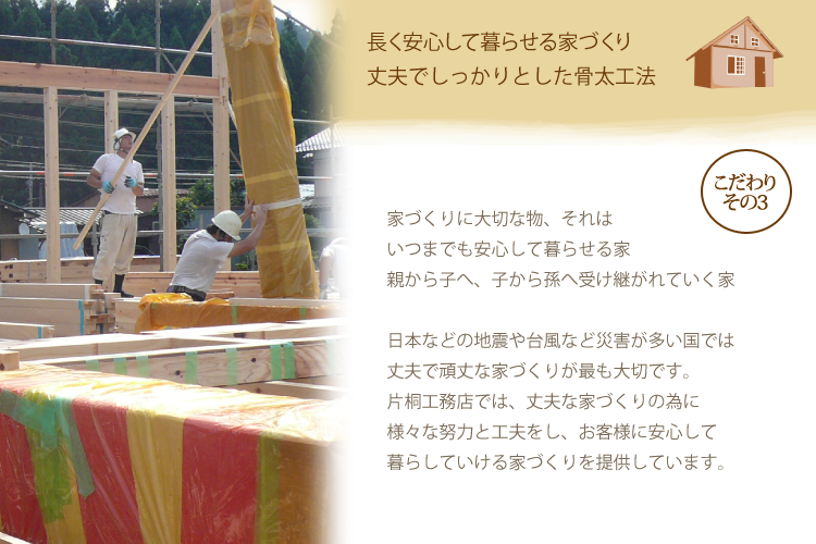 通常、一般的に建てる柱の寸法は3.5寸(105mm)の柱を用いているのですが、当社では4寸柱(120mm)の郡上産桧材を使用しております。片桐工務店の家は基準の1.5倍の強度があり、耐震等級3級という最高レベルの等級を実現しています。