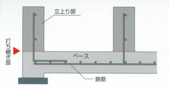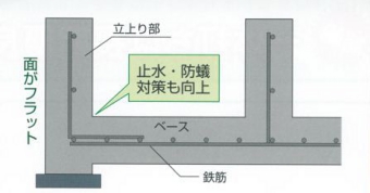 往来の2度打ち工法では、ベースを施工した後に立ち上がり部を施工するので、打ち継ぎ部の強度が弱くなってしまいます。また、隙間から水が侵入して鉄筋が錆びる場合もあります。