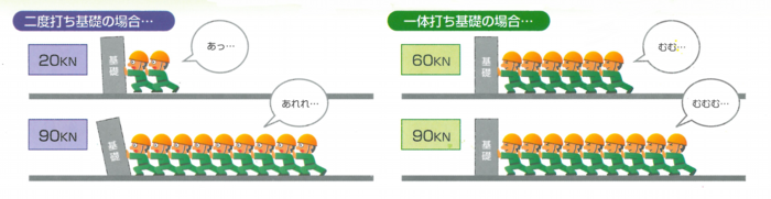 2度打ち工法とベタ基礎一体打ち工法との強度の比較をしてみました。2度打ちと比べて、ベタ基礎一体打ち工法の方が明らかに強いことがわかります。